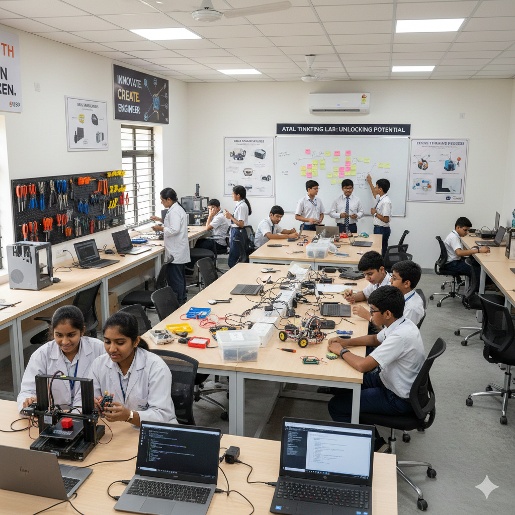 An ATAL Tinkering Lab is a dedicated space for students to experiment, innovate, and create prototypes using advanced tools and technologies. It fosters critical thinking, problem-solving, and teamwork through engaging, hands-on projects.